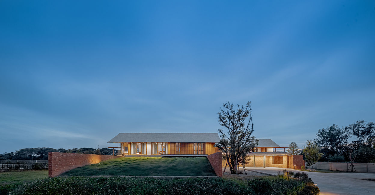 The architectural lines of the house are articulated through the use of brick and cast-in-place concrete walls textured with bamboo formwork. Brick wall planes and earthen mounds form another key characteristic of the house, drawing the surrounding greenery closer to the living spaces while visually grounding the building to the earth. These elements also help mediate the perceived height of the house, establish spatial boundaries, and organize an internal courtyard. Together with the bamboo-textured concrete walls, they unify the architectural components into a cohesive whole.