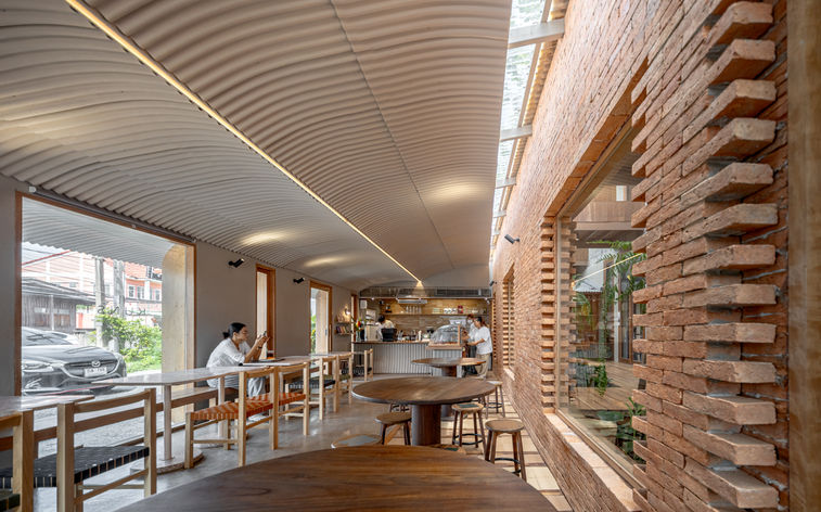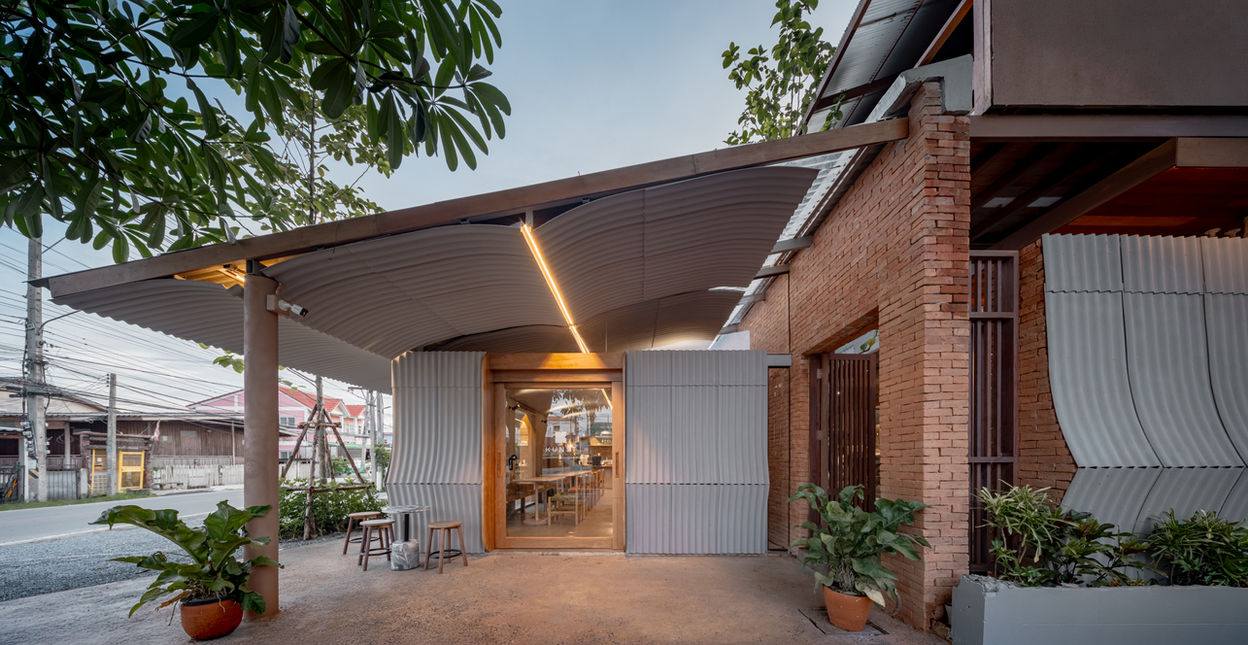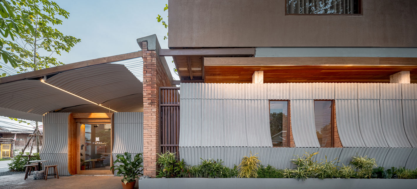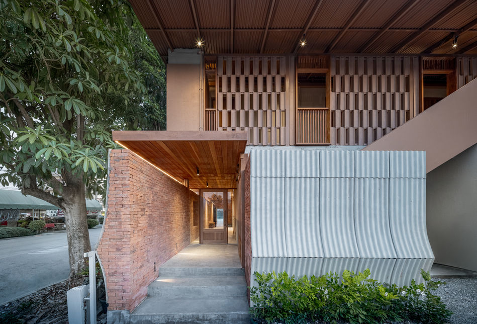 The design draws on the overlooked imagery and materials of daily life in old Ayutthaya—an architecture of subtlety, often unnoticed yet deeply ingrained. A key example is the use of small-curved corrugated roofing sheets, typically seen at the eaves of traditional Thai houses. Here, they are repurposed and celebrated—not as roofing, but as a primary surface treatment for façades, soffits, and boundary walls. Through this reinterpretation, the material transcends its original function, becoming a narrative tool that layers history, memory, and design intention.